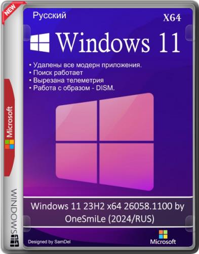 Windows 11 23H2 by OneSmiLe — сборка сделана на основе оригинального образа от Майкрософт Windows 11 Business Editions 23H 2 x64. Удалены все модерн приложения, поиск работает. Интегрированы актуальные обновления по февраль 2024 года, билд повышен до версии 26058.1100.